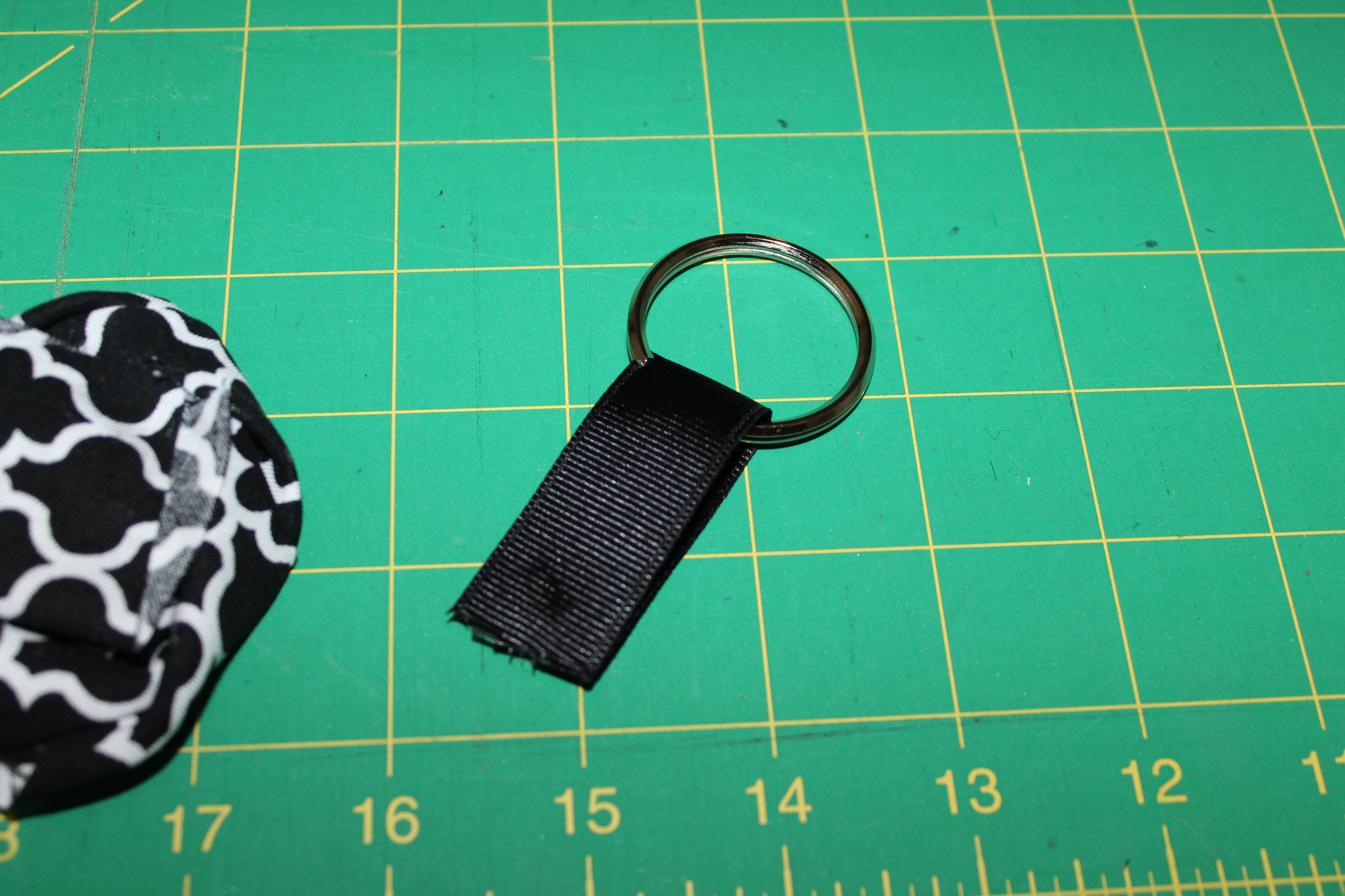 Next take your ribbon and fold it around the key ring. Glue the edges together.