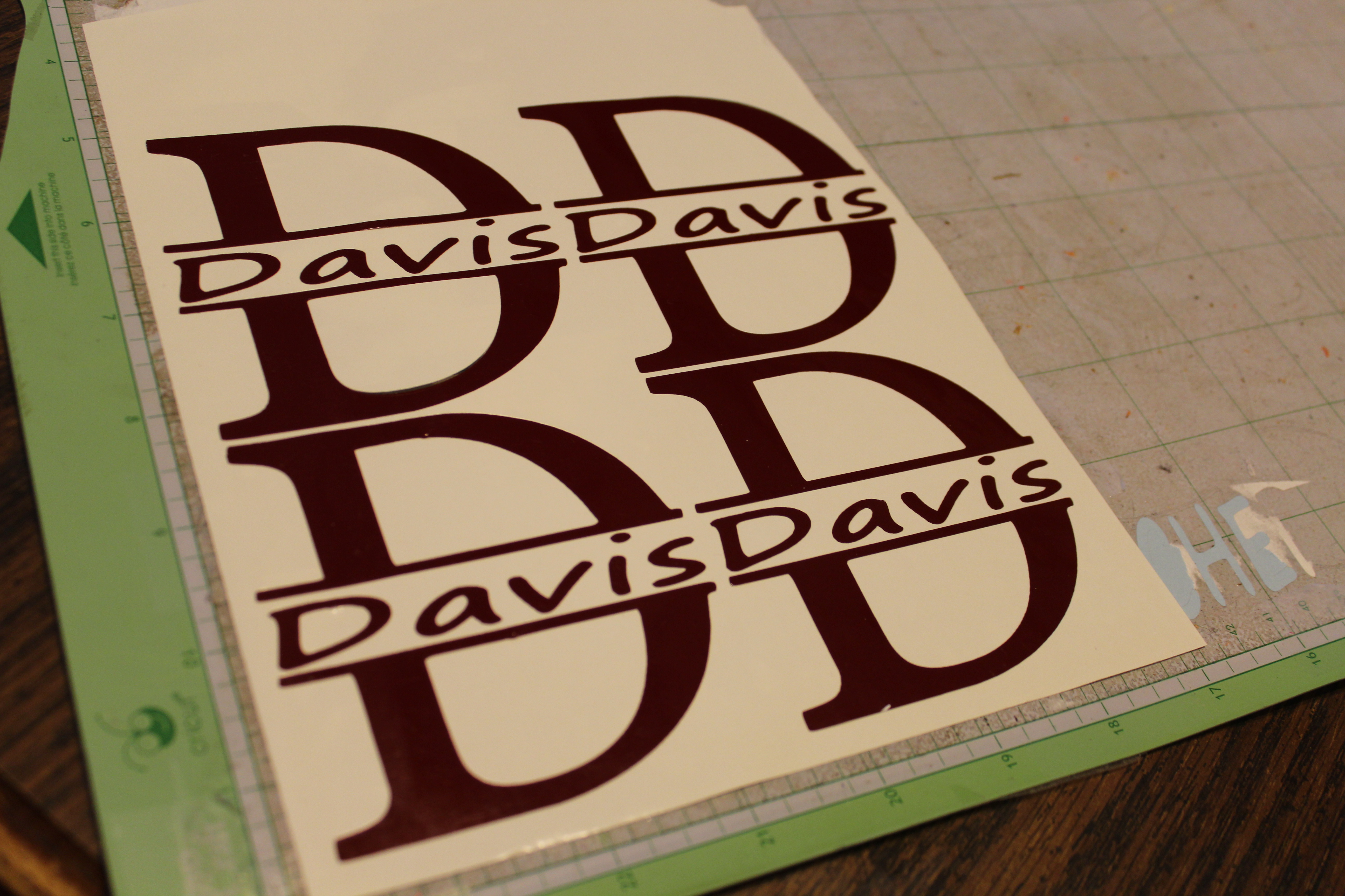 Start by cutting out your vinyl. I used my cricut. The letters measured 2 1/2″ x 2 1/2″. Weed your vinyl by carefully pulling away all the excess vinyl. Be very careful as you get to each new letter and especially pay close attention to the dot in the I! It is super easy to lose….don’t ask how I know that! Lol