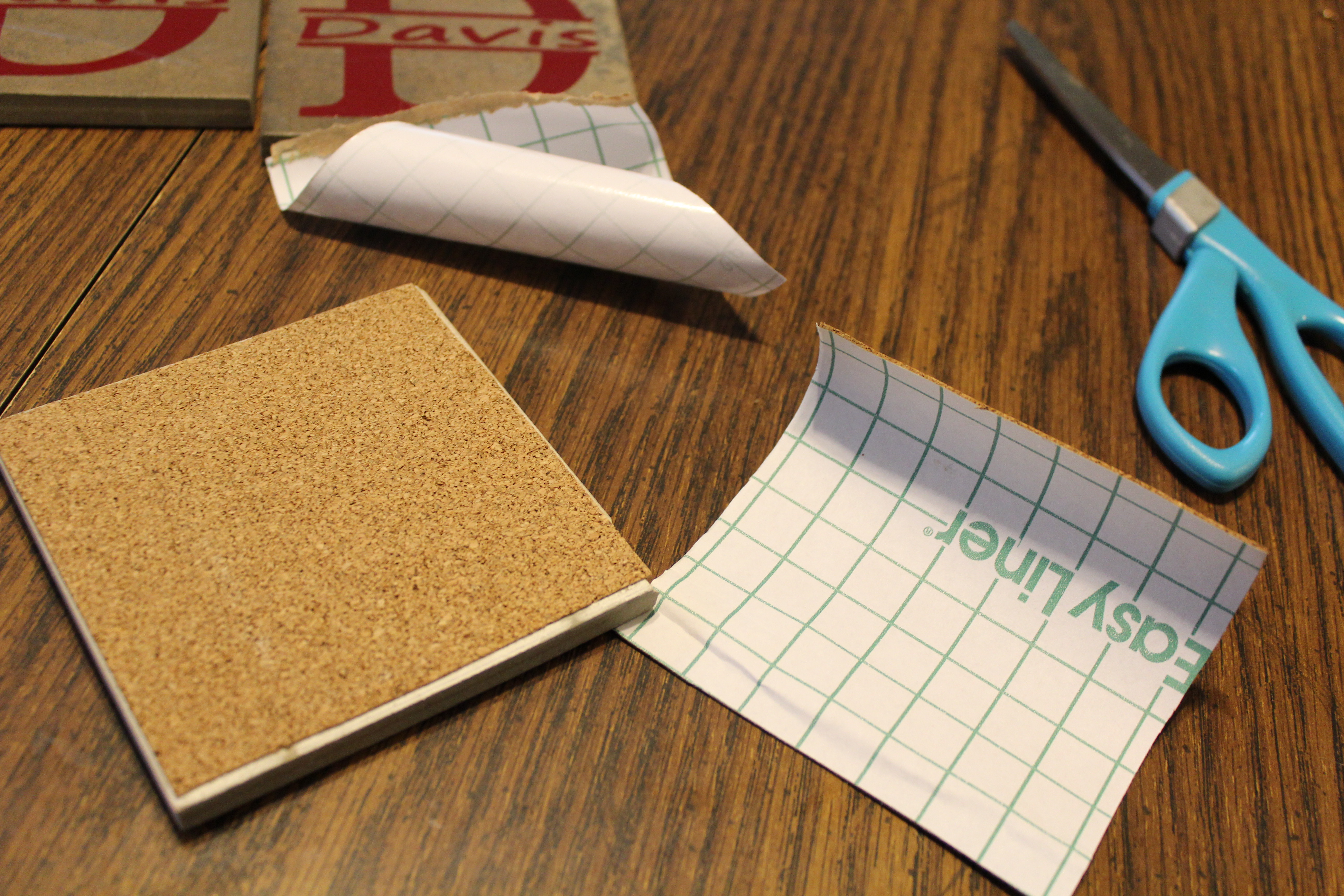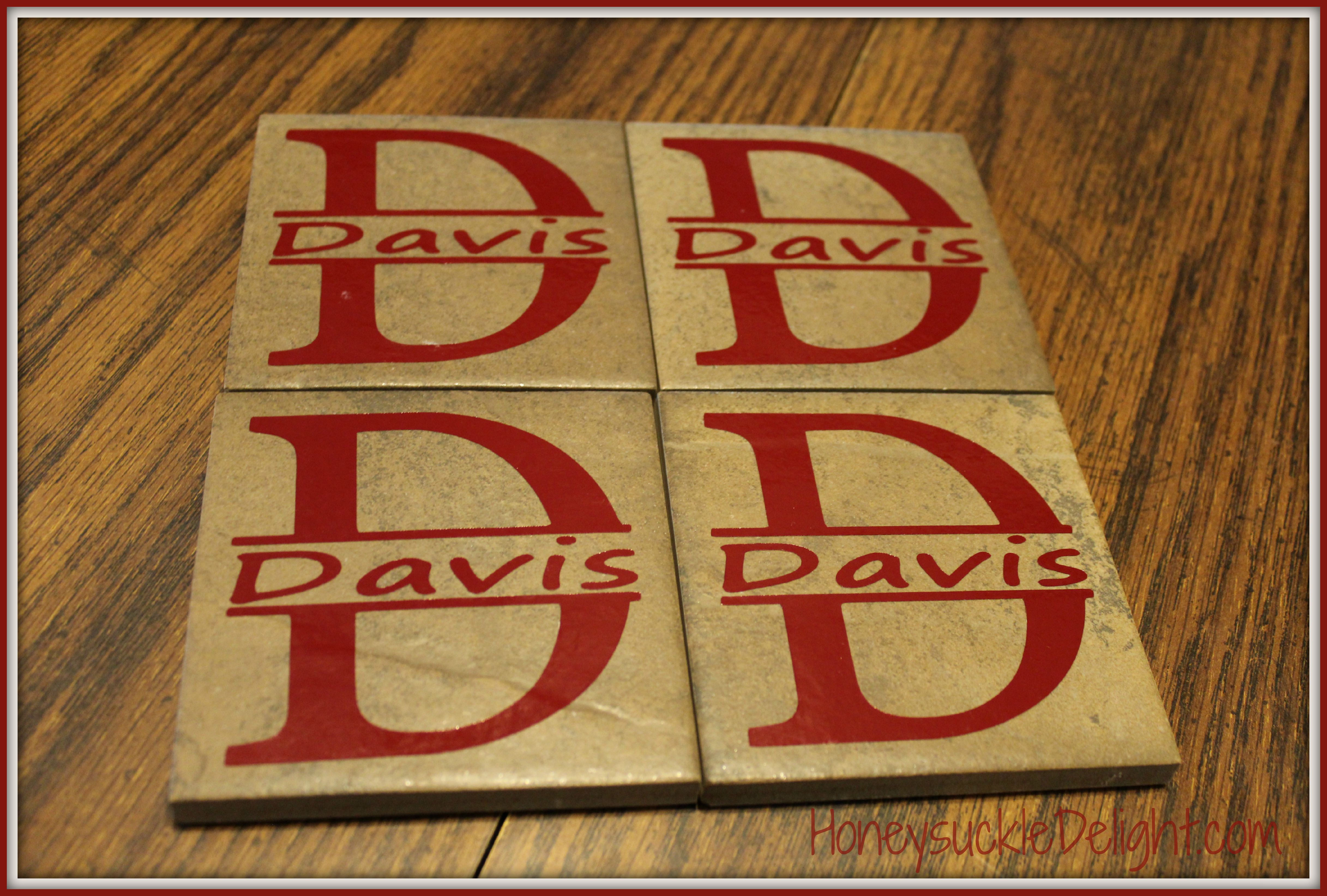 Now carefully peel off each name using the contact paper. Then transfer it to the top of the coaster. These letters were almost as big as the coaster so it was fairly easy to get them straight.