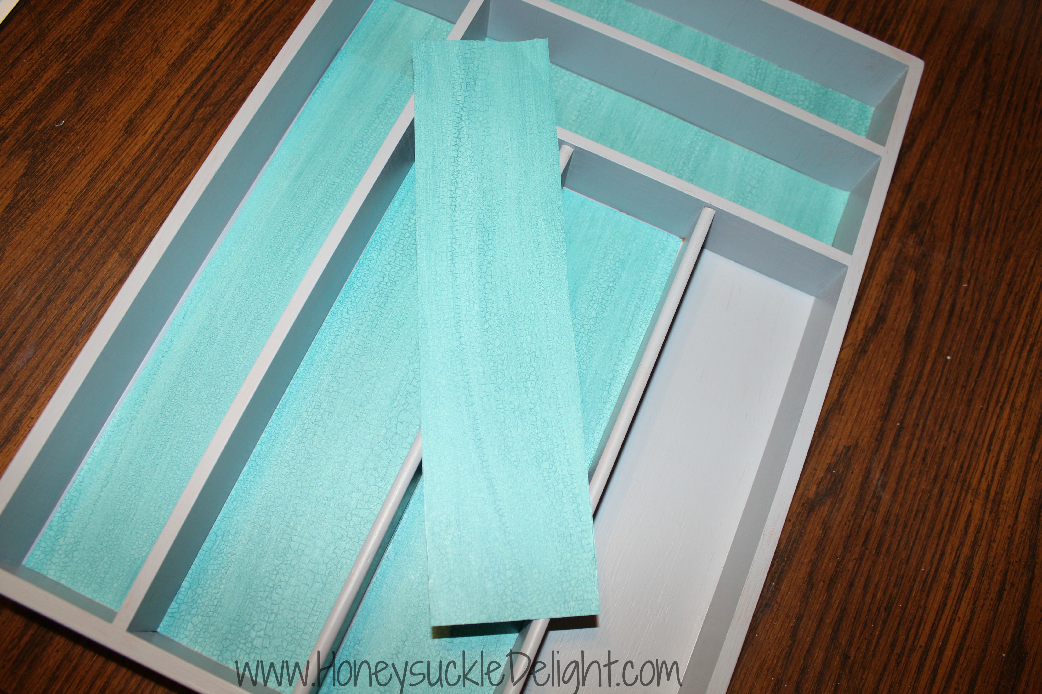 Start by painting the wooden silverware organizer. I chose gray because we had planned on hanging it on a blue wall. You don’t have to worry much about the bottom since you will be putting scrapbook paper over it. But make sure to cover the front edge and all sides well. While it’s drying cut your scrapbook paper to fit inside each cubby hole.