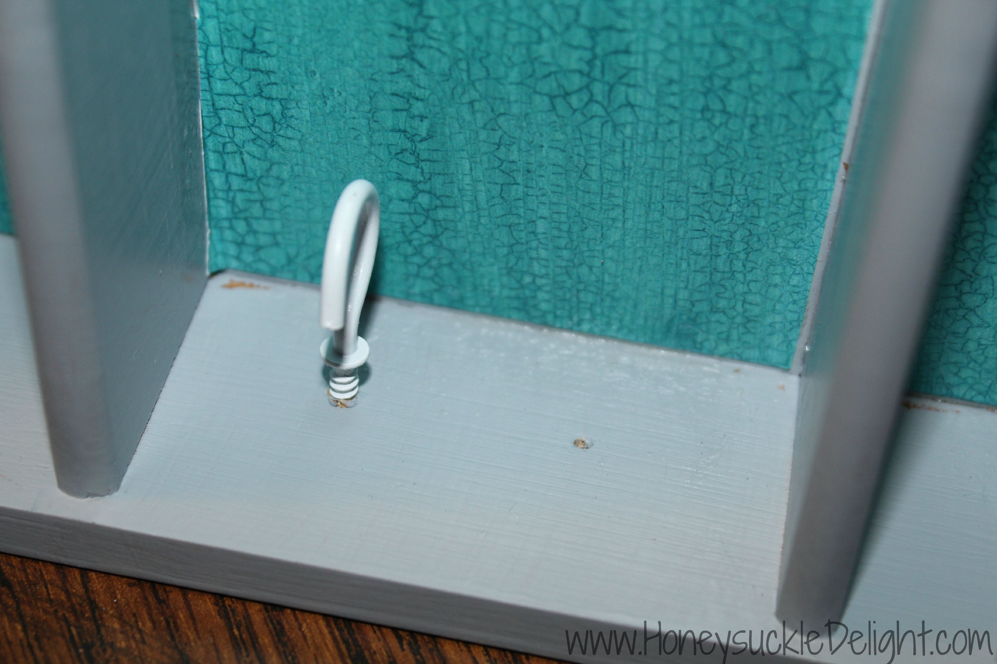 Once that’s dry, the last step is the hooks. I found these at Michael’s 20 for $2.99 in the framing section. They had them at Hobby Lobby as well but they were more expensive. I hammered them in a little to start and then screwed them in enough to hold. Make sure not to go all the way through the wood. Mine would have screwed quite a bit farther than what was necessary. Then you’ll have a hole all the way through. Please be careful!